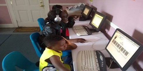 Learning their first scales in beginner piano class.